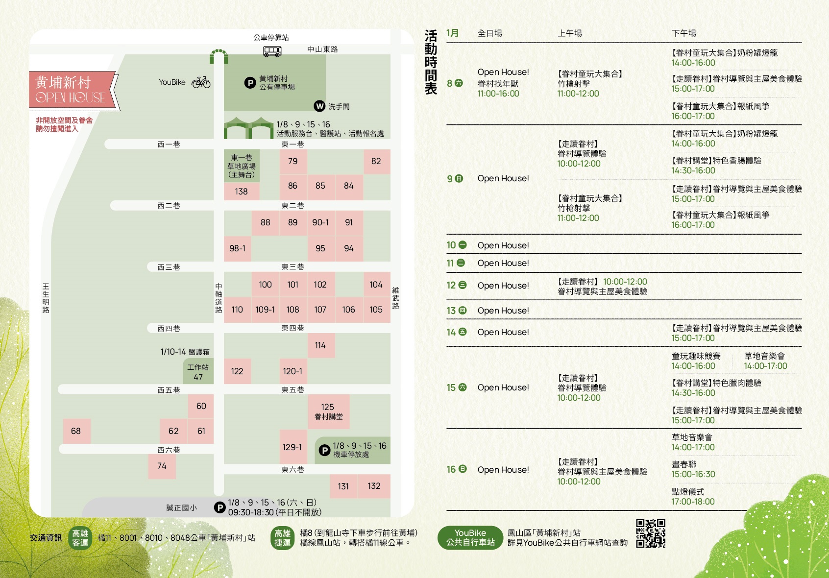 「以住代護」系列計畫自103年推動以來,讓黃埔成為高雄新的文創人才聚落,建築師、結構技師、織品設計師、眷村民宿、文創工作室等各界好手聚首,還有眷後代的老朋友們,都將在眷村嘉年華期間,打開大門迎接貴客臨門,好奇老屋如何修繕、想參觀眷舍或是體驗眷村民宿,不妨在趁著新年前的最後週末假期,來到黃埔串門子吧!