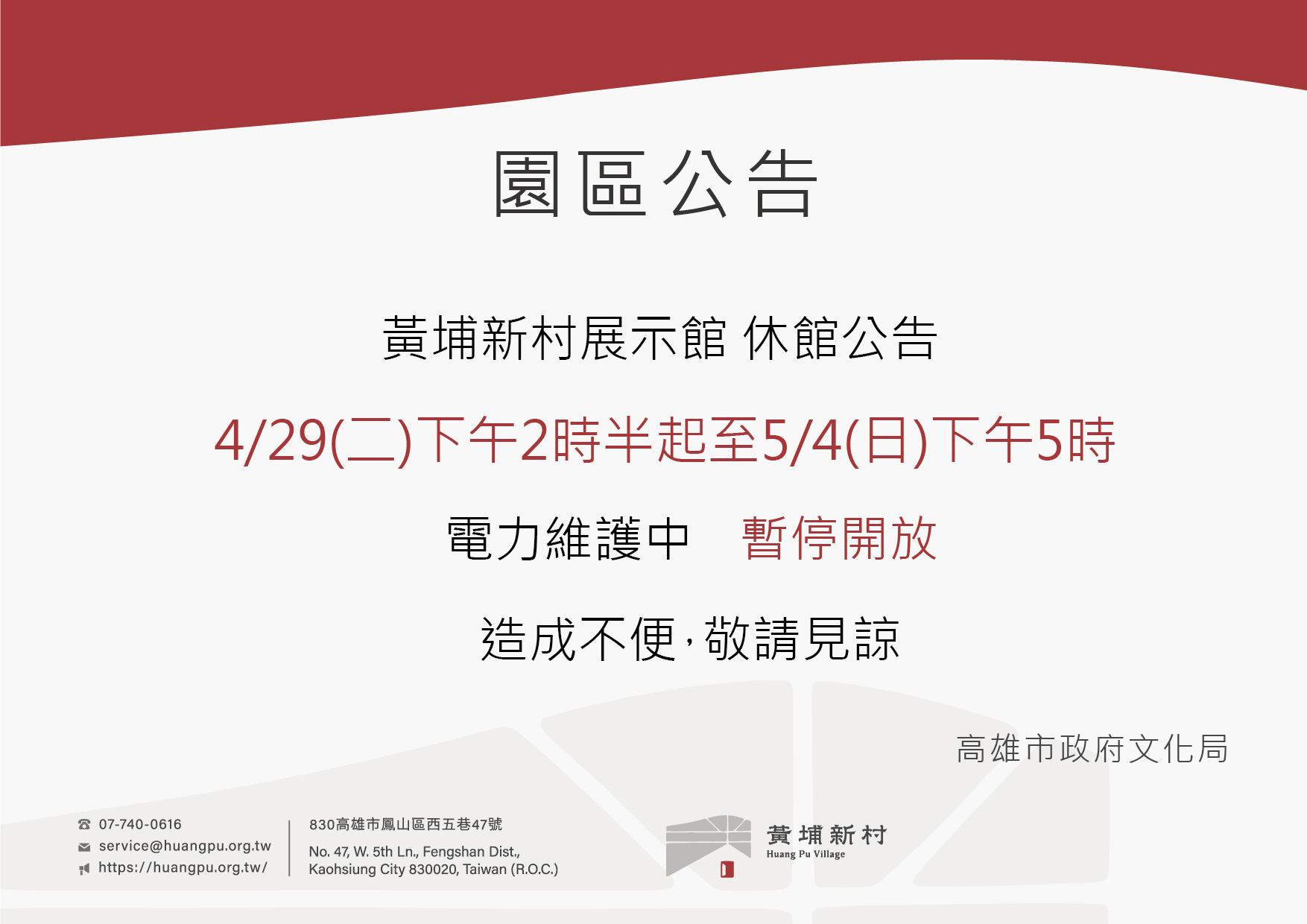 因電力維護中,故黃埔新村展示館暫停開放。