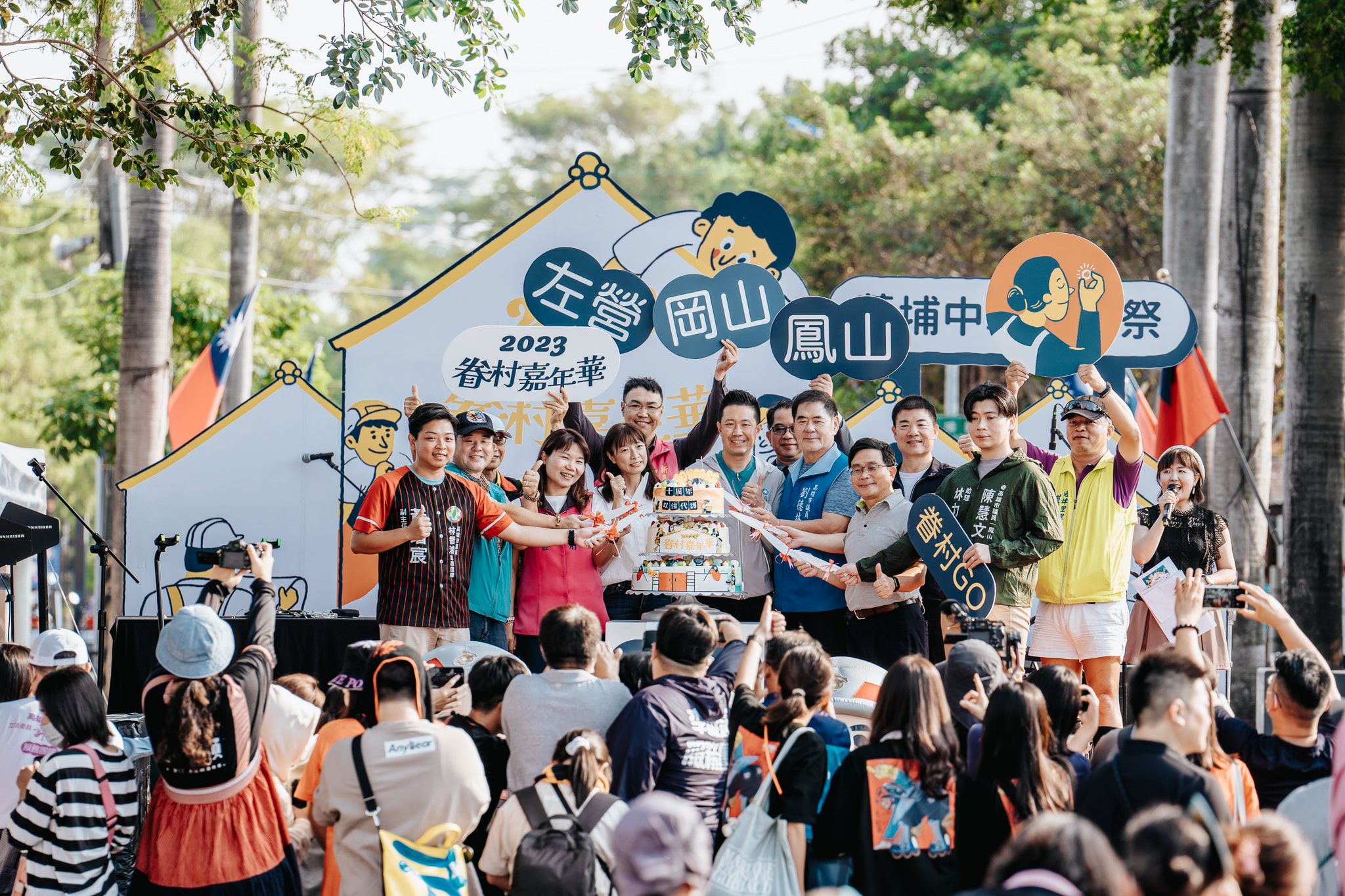 2023高雄眷村嘉年華今日(5日)於鳳山黃埔新村劃下完美句點,現場由高雄市政府文化局副局長林尚瑛、高雄市議員劉德林、鍾易仲、李雅靜等人共同切下巨大三層蛋糕,為以住代護計畫十周年慶生。今年馬拉松式連續三周、百餘檔精彩活動於三軍眷村一一落幕,累計逾五萬人次參與,最後在黃埔新村中軸道音樂祭的搖滾音浪中,眾人嗨唱迎向未來。